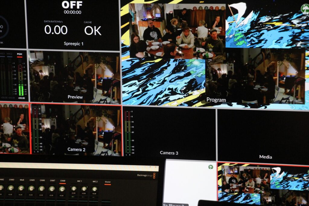 • 2-3 camera set up with wireless mics for live streaming or video recording and editing